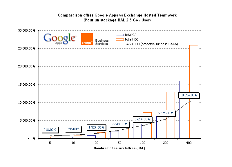 Concernant la taille des boites aux lettres, GA propose 25Go/utilisateur alors que les offres Hosted Exchange n’incluent que 200Mo/utilisateur, j’ajouterais donc le surcoût de 24300Mo supplémentaire par utilisateur à l’offre Hosted Exchange comparée.